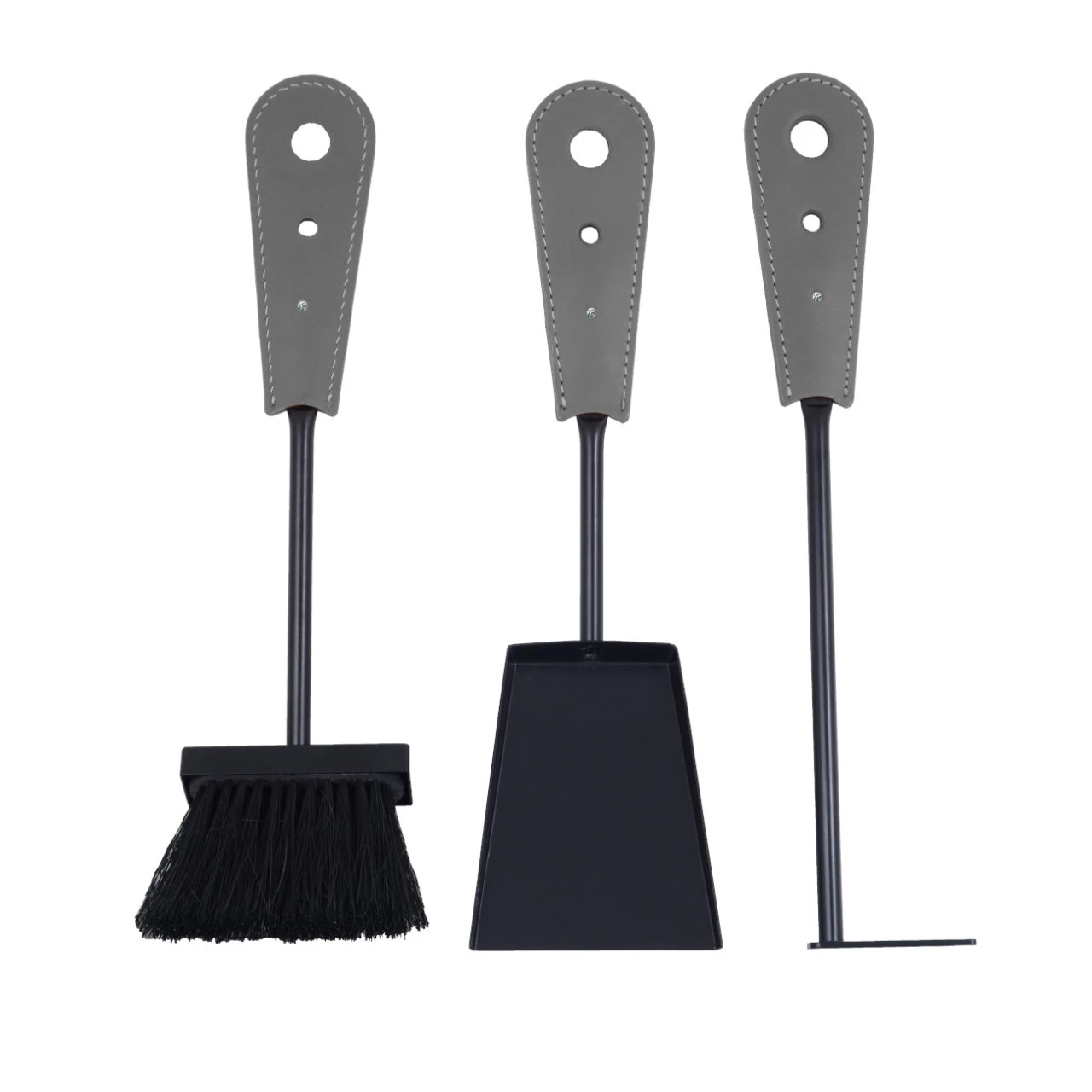 Das Kaminbesteck besteht aus einer Schaufel, einem Schürhaken und einem Besen, alles aus lackiertem Stahl.