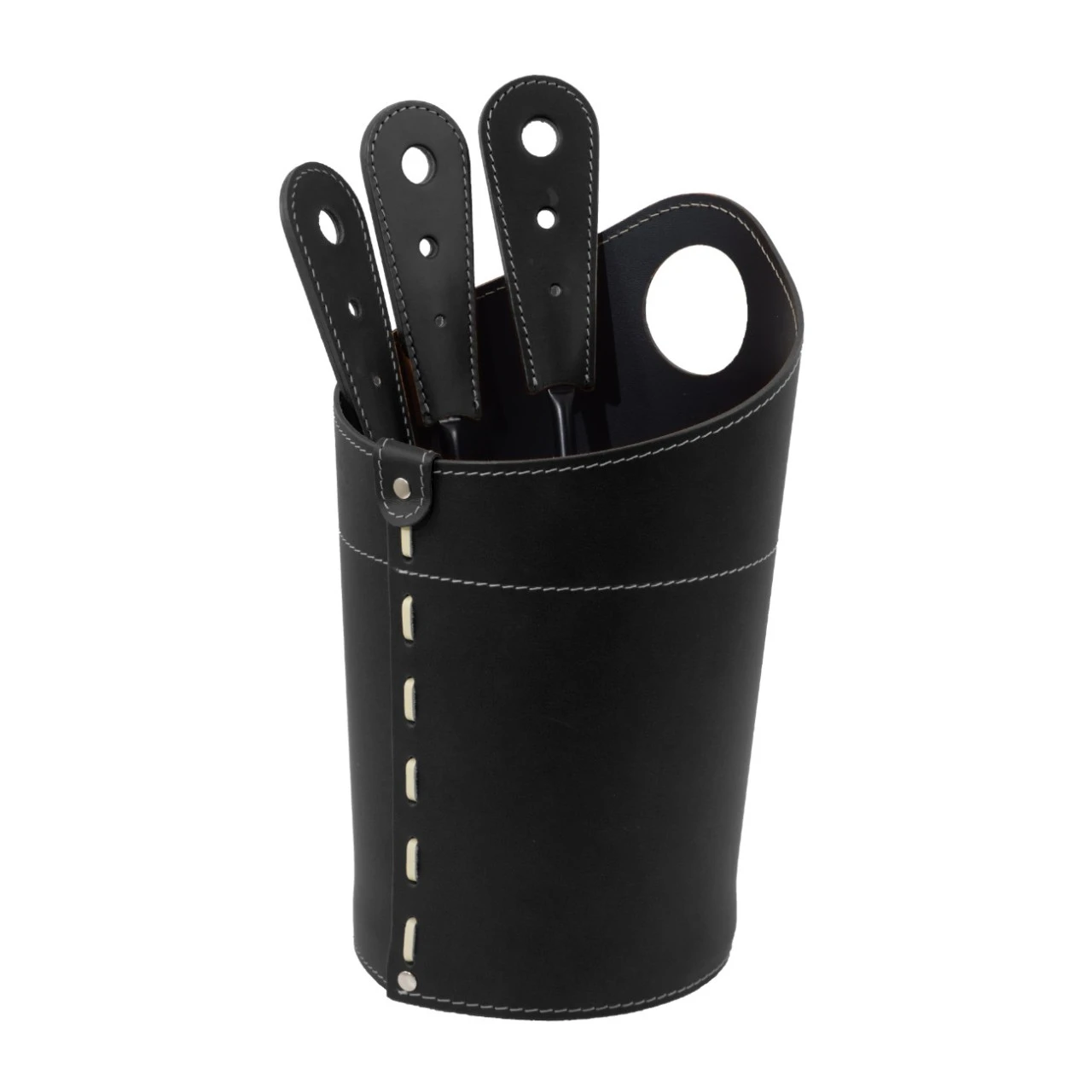 Set bestehend aus Kaminbesteckhalter aus Leder mod. „Brogio“ und 3-teiliges Kaminbesteck mit Ledergriff mod. „Corla“