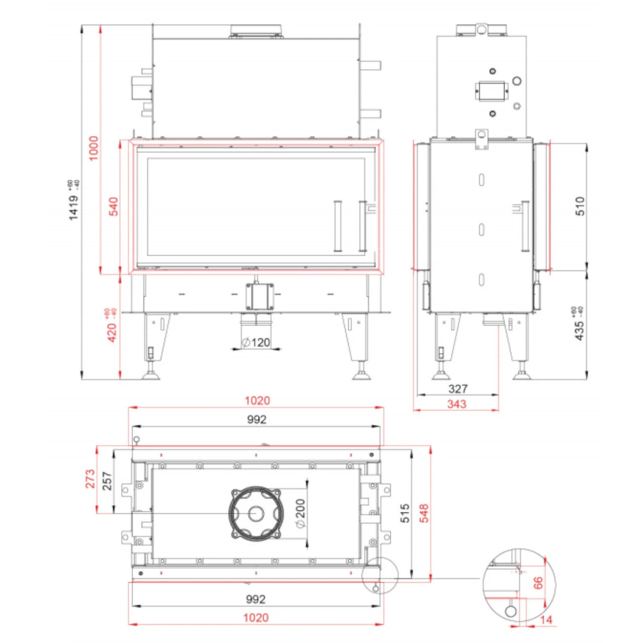 - Maße des Kamins: Höhe: 141,9 (+6,0/-4,0) cm x Breite: 102,0 cm x Tiefe: 54,8 cm