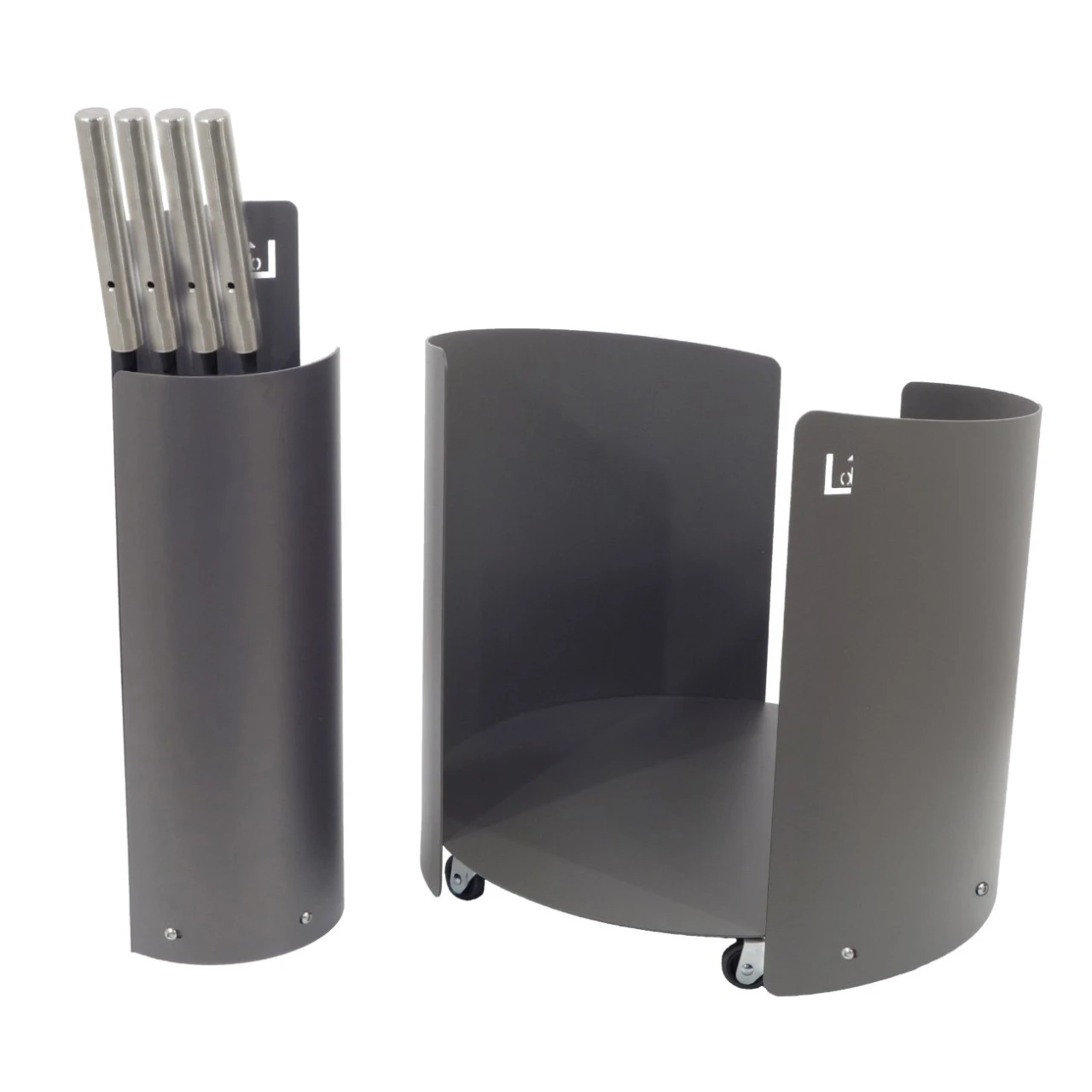 Set bestehend aus Kaminbesteckhalter aus Stahl Mod. „Anery“ und 4-teiliges Kaminbesteck Mod. „Ares“ und Holzscheithalter Arena