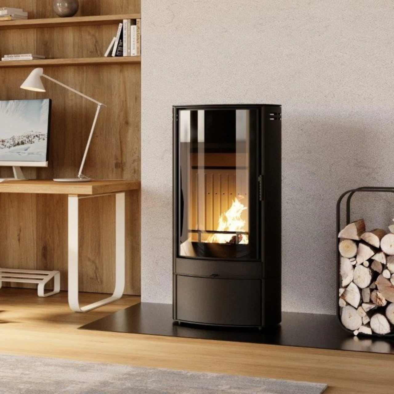 Der freistehende Kaminofen ARCO passt mit seiner schlanken und kompakten Form auch perfekt in kleinere Räume. Eindrucksvoll ist die hochgewölbte Glasscheibe, die eine schöne vertikale Sicht auf das Feuer ermöglicht. ARCO-Kaminöfen werden in drei Formen angeboten: F1 auf dezentem Trompenfuß, F2 mit Holzfach, F3 mit geschlossener Tür.