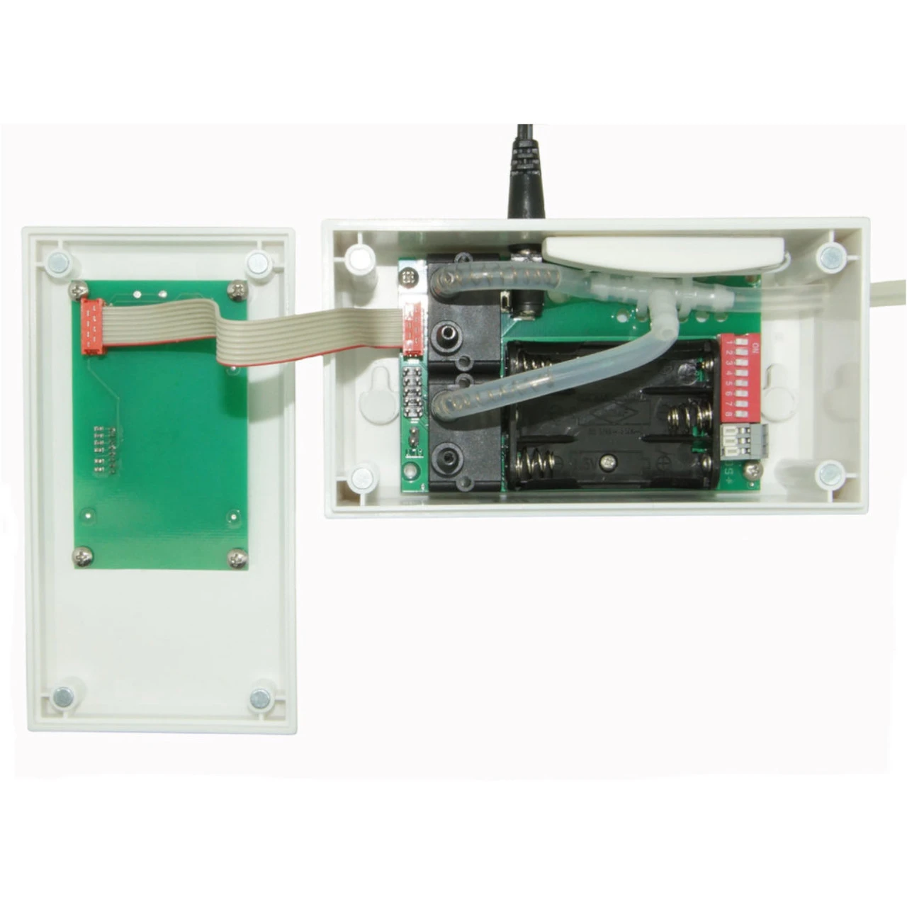 - Die Dippschalter von den Temperatursensor, der Funksteckdose und von den Differenzdrucksensor müssen alle gleich eingestellt werden. Beim Differenzdrucksensor muss der Betriebsmodus eingestellt werden.