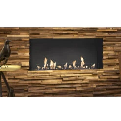Dieser Kamineinsatz hat verstellbare Flammen und glühende Holzscheite und Kohlen. Links und rechts befindet sich eine Glasplatte, die den Eindruck eines Gaskamins erweckt. Die Frontseite ist offen.