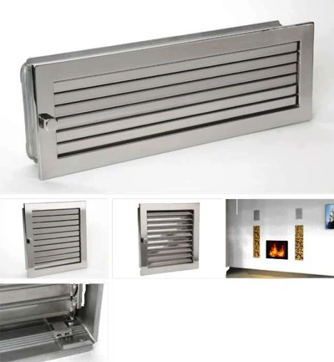 Warmluftgitter mit verstellbaren Lamellen aus Edelstahl in geschliffener oder hochglänzender Ausführung komplett mit Einbaurahmen aus verzinktem Stahlblech. Hochwertige Edelstahlgitter in geschliffener und hochglänzender Ausführung.