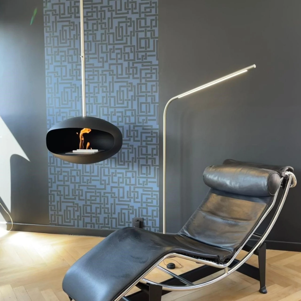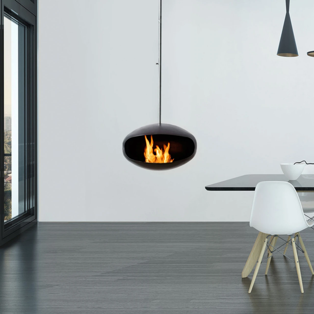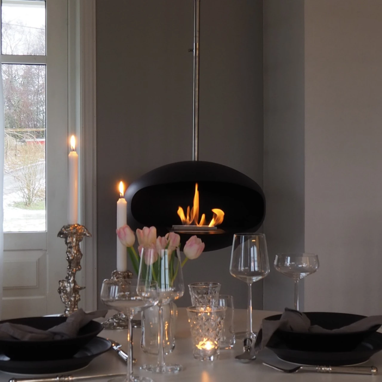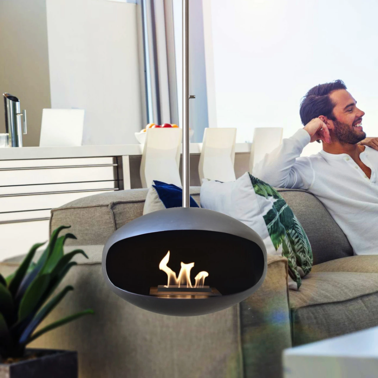 Der luxuriöse und moderne AERIS Biokamin ist ein hängendes Designelement, das die volle Einstellbarkeit eines modernen Hängekamins bietet. Die Hängestange ist in sechs verschiedenen Höhen mit einer Drehung um 360° einstellbar (nur bei Edelstahl Teleskopstange).