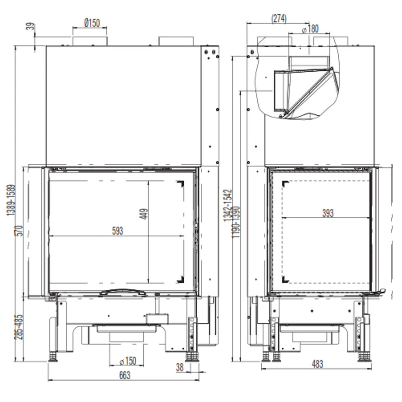 Abstand zu brennbaren Materialien: vorne ab Sichtscheibe 80 cm, ab Seitenscheibe: 80 cm