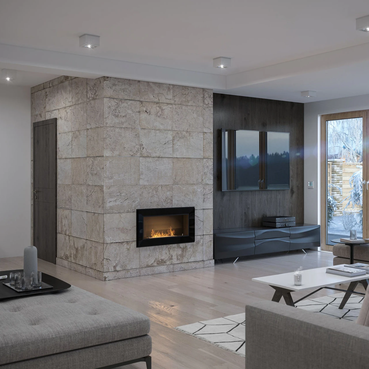 Der Ethanolkamin von SIMPLE fire, FRAME 900, eignet sich bestens zum Einbau in einer Nische oder zum befestigen an einer Wand. Die Konstruktion des Ethanolkamins gewährleistet eine einfache Montage und eine effektive Ausarbeitung, ohne dass der Rand der Aussparung in der Wand ideal bearbeitet werden muss. Der Ethanolkamin ist mit einer Glasscheibe erhältlich, welche die Sicherheit des Ethanolkamins noch einmal erhöht. Der FRAME 900 ist erhältlich in 3 unterschiedlichen Farben – Schwarz, Weiß oder Inox (Edelstahl) – mit Schutzglas.