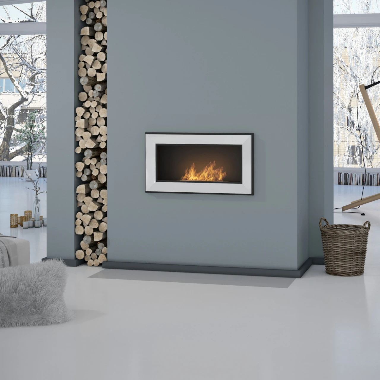 Der Ethanolkamin von SIMPLE fire, FRAME 900, eignet sich bestens zum Einbau in einer Nische oder zum befestigen an einer Wand. Die Konstruktion des Ethanolkamins gewährleistet eine einfache Montage und eine effektive Ausarbeitung, ohne dass der Rand der Aussparung in der Wand ideal bearbeitet werden muss. Der Ethanolkamin ist mit einer Glasscheibe erhältlich, welche die Sicherheit des Ethanolkamins noch einmal erhöht. Der FRAME 900 ist erhältlich in 3 unterschiedlichen Farben – Schwarz, Weiß oder Inox (Edelstahl) – mit Schutzglas.