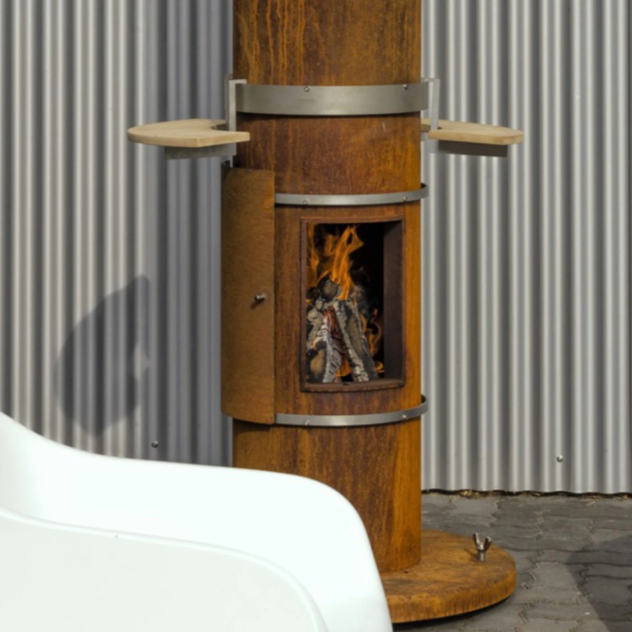 Eine schlanke, runde Kamingestaltung in ganz reduzierter Formensprache: Die lebendige Optik des Edelrostes und die Edelstahldetails spielen hier die Hauptrolle. Damit ist Tower eine beeindruckende und gleichzeitig zurückhaltende Erscheinung, die zum Herzstück deiner Terasse wird.