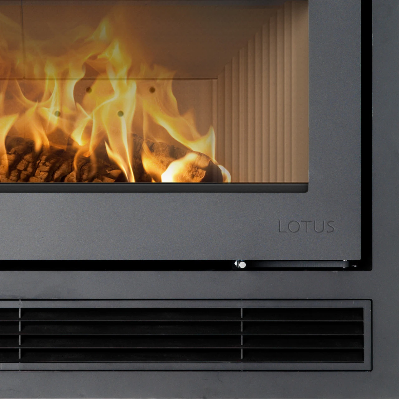 Die Lotus-Kamineinsätze mit eingebautem Ventilator – das Air-Modell – ermöglichen die Verteilung der Wärme in mehrere Zimmer. Kalte Raumluft wird durch das Gitter unter der Tür angesaugt und erwärmt. Die warme Luft wird über das Gitter über der Tür abgegeben oder über Rohre in andere Zimmer geleitet. Der Ventilator lässt sich stufenlos bis auf 300 m3 Luft pro Stunde einstellen. So haben Sie es im ganzen Haus schön warm. Die folgenden Modelle sind mit Ventilator erhältlich: H470, H570, H470 W und H570 W. Diese werden mit schwarzer oder grauer Stahlfront geliefert. Alle Lotus-Kamineinsätze werden mit dem Öffnungsgriff auf der rechten Seite geliefert, und die Scharniere sind standardmäßig links montiert. Optional kann die Kaminkassette ohne Aufpreis auch spiegelverkehrt geliefert werden, sofern dies bei der Bestellung angegeben wird.