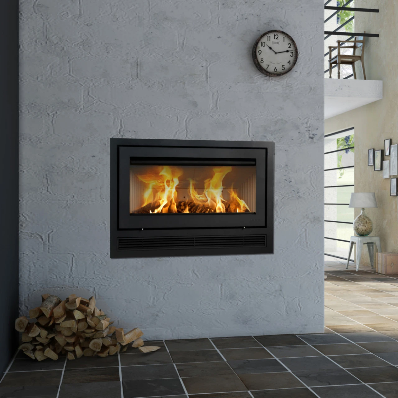 Die Lotus-Kamineinsätze mit eingebautem Ventilator – das Air-Modell – ermöglichen die Verteilung der Wärme in mehrere Zimmer. Kalte Raumluft wird durch das Gitter unter der Tür angesaugt und erwärmt. Die warme Luft wird über das Gitter über der Tür abgegeben oder über Rohre in andere Zimmer geleitet. Der Ventilator lässt sich stufenlos bis auf 300 m3 Luft pro Stunde einstellen. So haben Sie es im ganzen Haus schön warm. Die folgenden Modelle sind mit Ventilator erhältlich: H470, H570, H470 W und H570 W. Diese werden mit schwarzer oder grauer Stahlfront geliefert. Alle Lotus-Kamineinsätze werden mit dem Öffnungsgriff auf der rechten Seite geliefert, und die Scharniere sind standardmäßig links montiert. Optional kann die Kaminkassette ohne Aufpreis auch spiegelverkehrt geliefert werden, sofern dies bei der Bestellung angegeben wird.