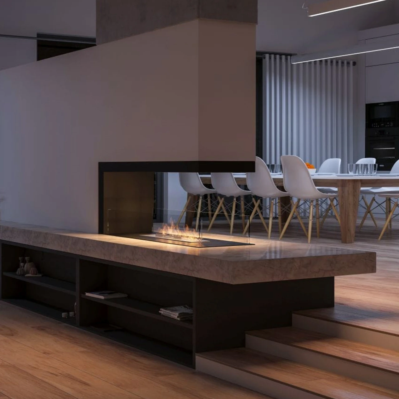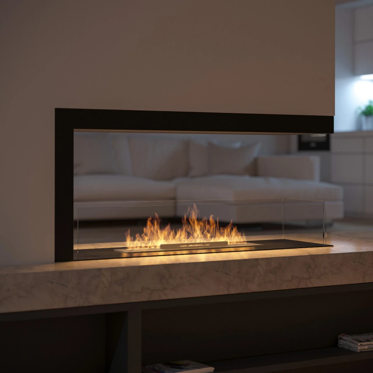 Das Modell INSIDE U 1000 ist ein Panorama Kamin, der in einer vorbereiteten Nische montiert werden kann. Der Kaminrahmen enthält ein Belüftungssystem, das verhindert, dass Druck unter dem Brenner entsteht, wenn der Kraftstoff überläuft. Der Rahmen ist außerdem mit 3 Scheiben ausgestattet, die in spezialen Schienen eingesetzt worden sind, sodass Sie alle Befestigungen ausblenden können. Der Kaminrahmen verfügt außerdem über eine eingebaute Isolierung, die eine sichere Montage z. B. in MDF- oder Gipskartonkonstruktionen ermöglicht. Der Kamin kann eine schöne und effektive Verbindung zwischen zwei Räumen darstellen.