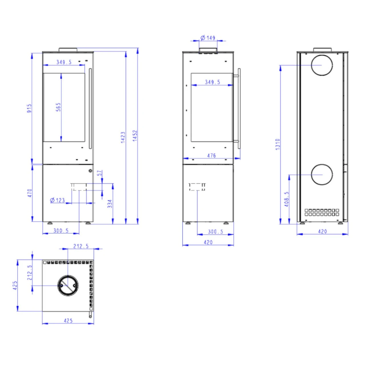 - Abstand von Mitte des Rauchstutzens bis zur Hinterkante des Ofens: 21,25 cm;