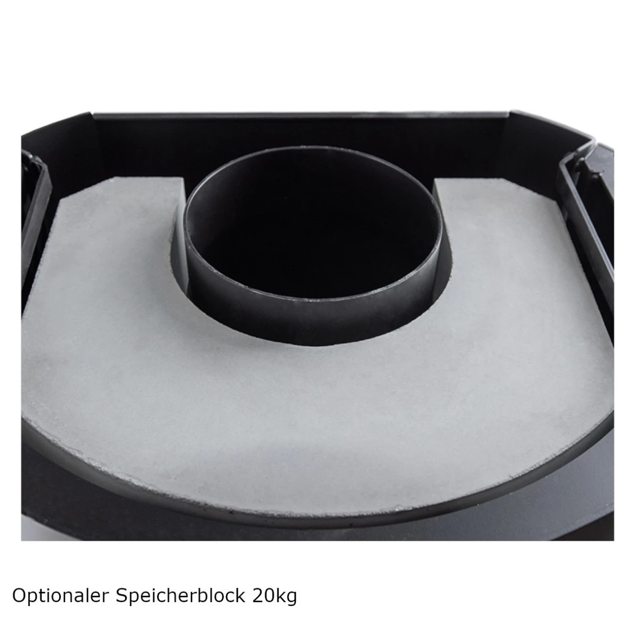 - Wärmespeicherung: Ja mit Natursteinen, die Wärme wird noch über mehrere Stunden abgegeben, nachdem das Feuer längst erloschen ist. Dies ist möglich durch die Natursteine, die wie ein Akku funktionieren; Optional mit zusätzlichen ca. 20 kg Speichermaße