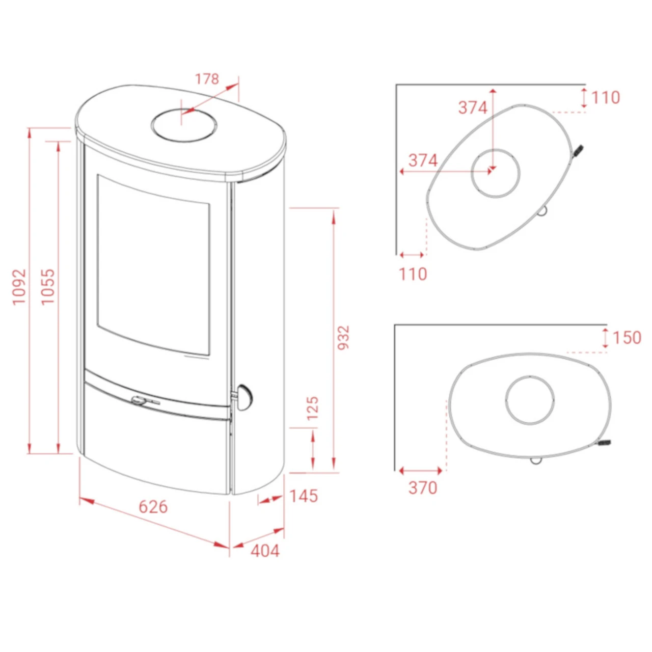 - Abstand von Mitte des Rauchstutzens bis zur Hinterkante des Ofens: 17,8 cm;
