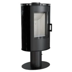 - Kaminofen mit Trompetenfuß. Der Kaminkorpus (oberer Teil) ist um 360° drehbar.