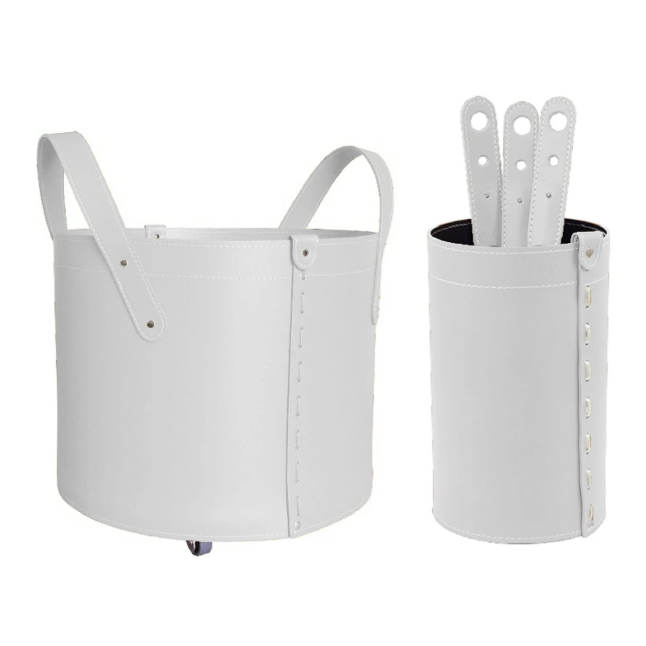 Set bestehend aus Kaminbesteckhalter aus Leder Mod. „Tista“ und 3-teiliges Kaminbesteck mit Ledergriff Mod. „Marty“. Holzkorb aus regeneriertem Leder Modell Tonda „Mini“