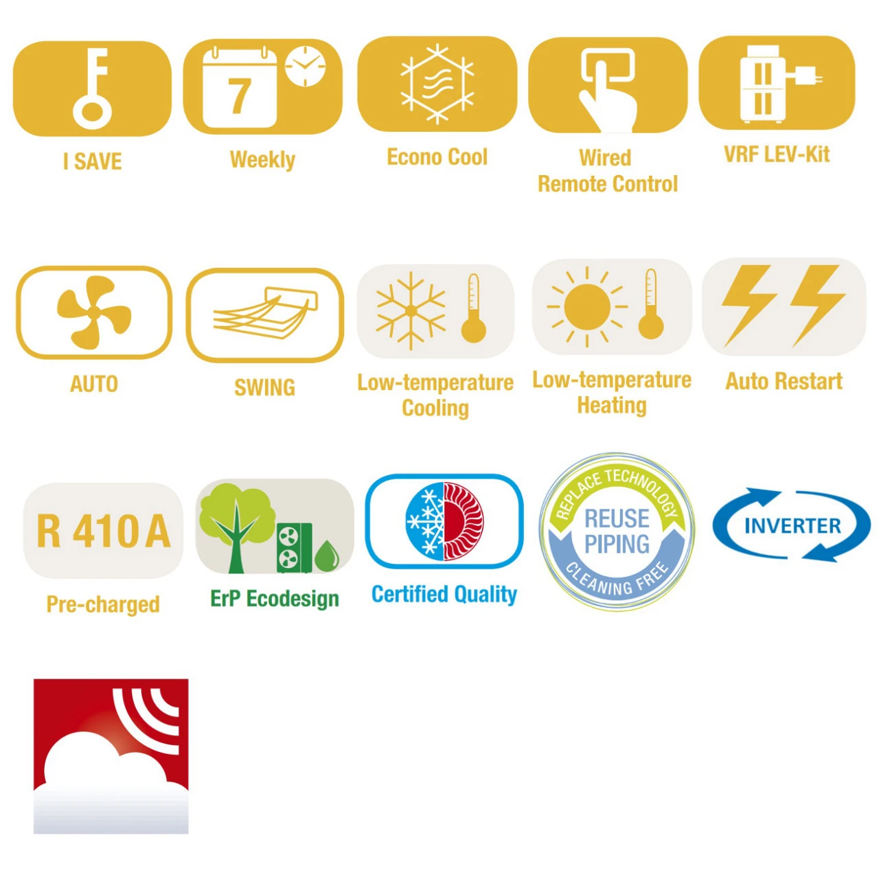 Econo Cool – Spart zusätzlich Energie, indem im Kühlbetrieb die Set- Temperatur automatisch um 2 °C angehoben wird. Die minimierte Kälteleistung wird durch ein spezielles Lüfterprogramm nicht wahrgenommen.