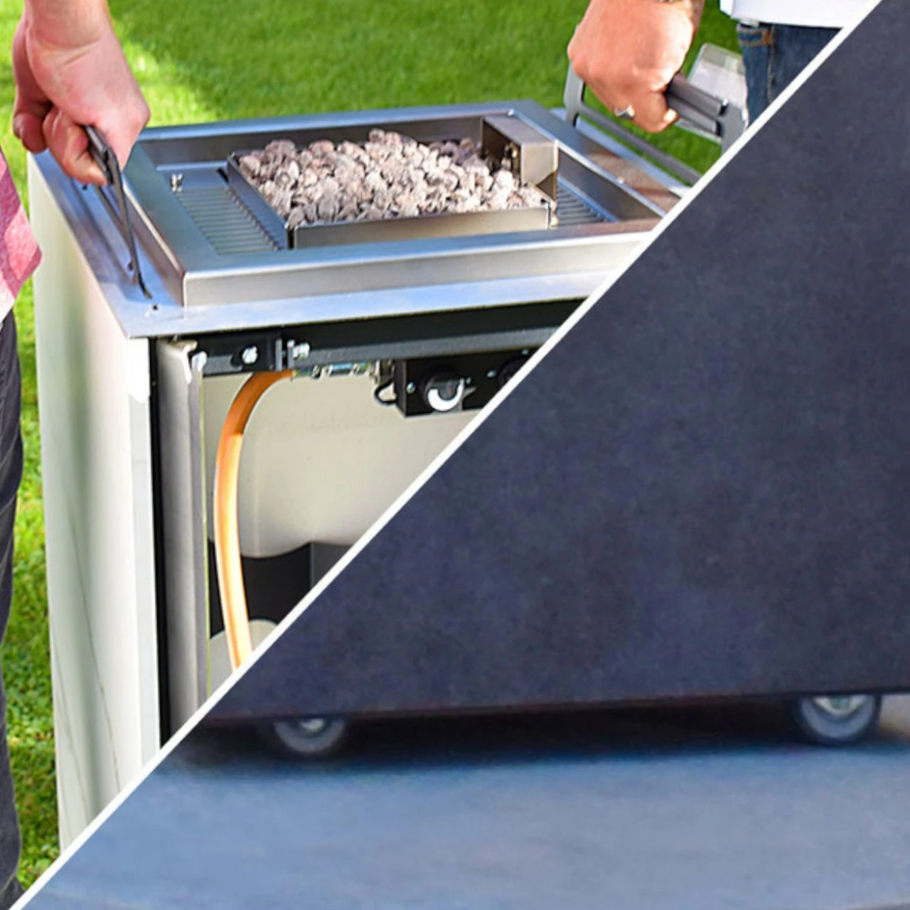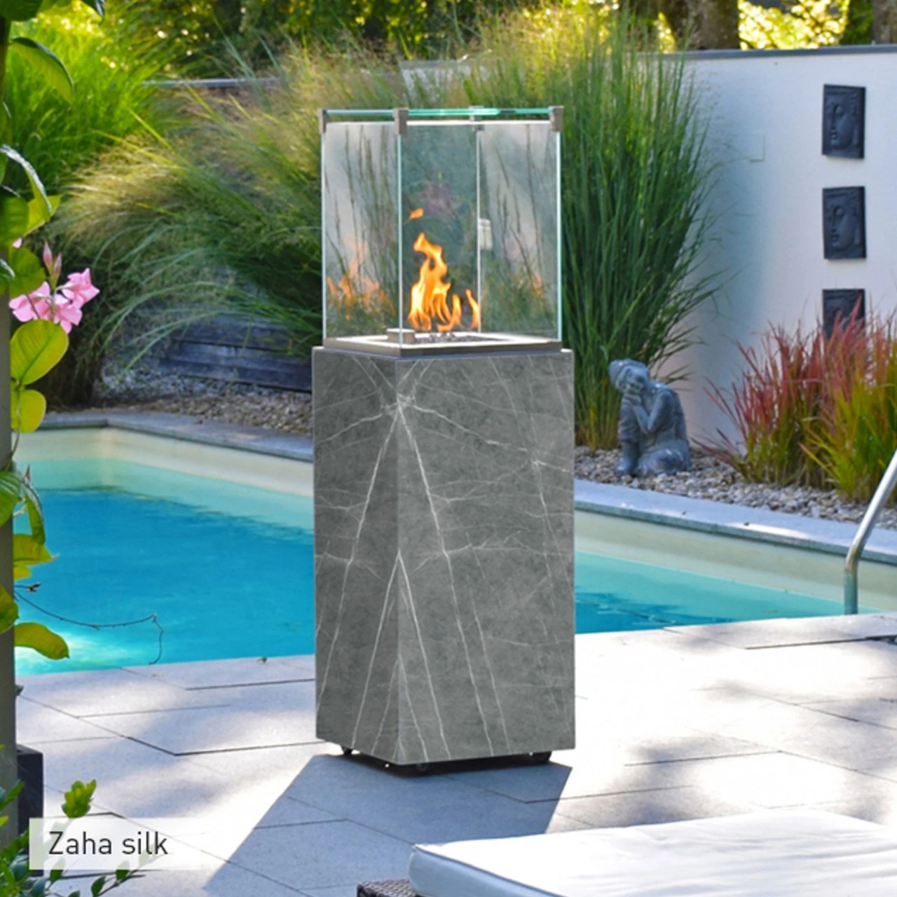 Die Kombination der exklusiven und hochwertigen Materialien schafft ein einmaliges Erscheinungsbild in jedem Ambiente – der Mittelpunkt jedes Gartens. Hochwertigste neolith® Sinterkeramik Oberflächen in Massivdesign harmonieren perfekt mit aufwendig gebürsteten Edelstahlbauteilen.