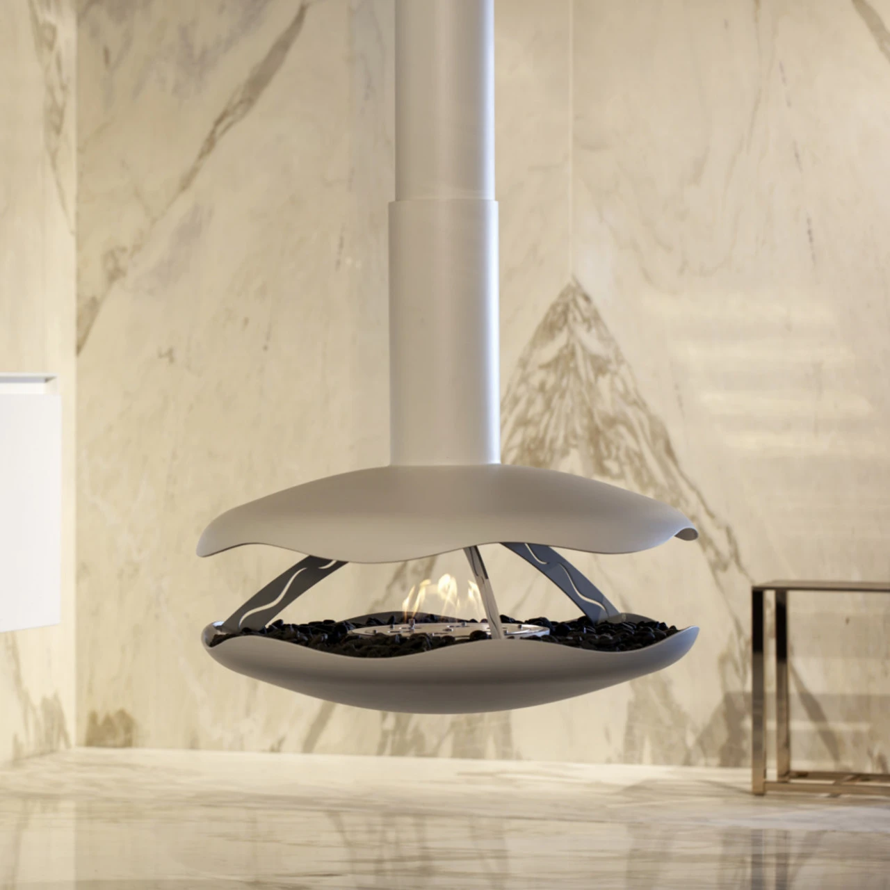 Ein hochästhetisch-funktionales Stück mit einem strengen Finish, das die hervorragende Handarbeit von GlammFire und seine Herangehensweise an das Konzept des hängenden Kamins repräsentiert.