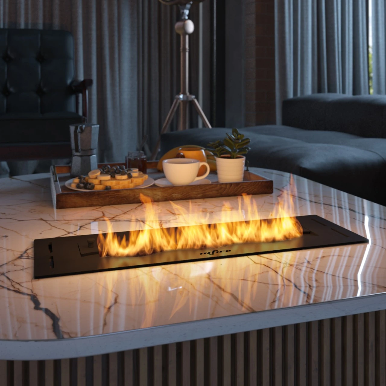 Eine Keramikfasereinlage mit Netz erhöht die Sicherheit und verlängert und optimiert den Brennvorgang. Mit der Schiebeleiste können Sie die Flammengröße anpassen und den Kamin sicher löschen, und durch die Wellenform entsteht ein zusätzlicher 3D-Effekt.