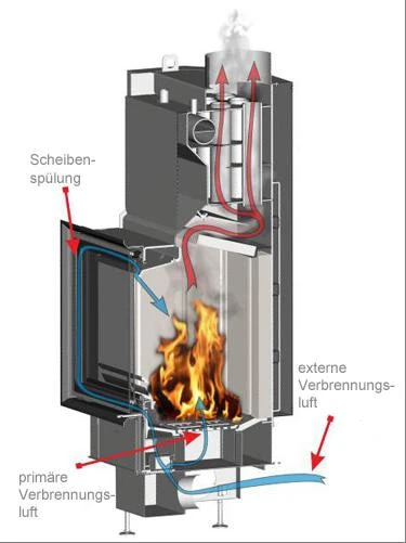 Scheibenspülung – Klare Sicht auf das Feuer – Luftstrom vor der Glasscheibe, dadurch wird die Verschmutzung der Scheibe minimiert