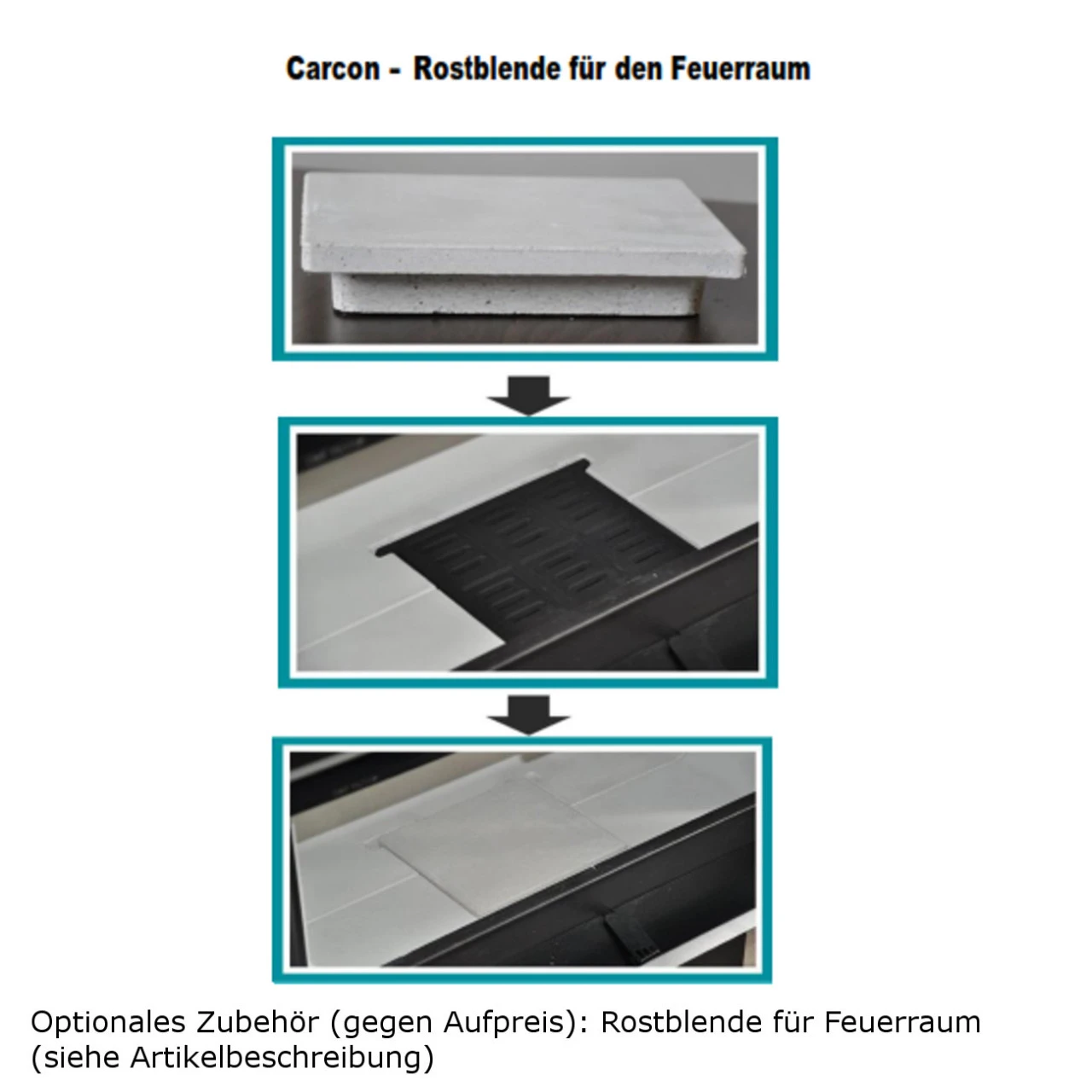 Die Carcon Brennraumauskleidung ist ein Keramischer feuerbeständiger Gussbeton, dieses Material lässt das Feuer heller wirken und hilft dabei Wärme abzugeben, auch wenn die Flammen bereits erloschen sind.