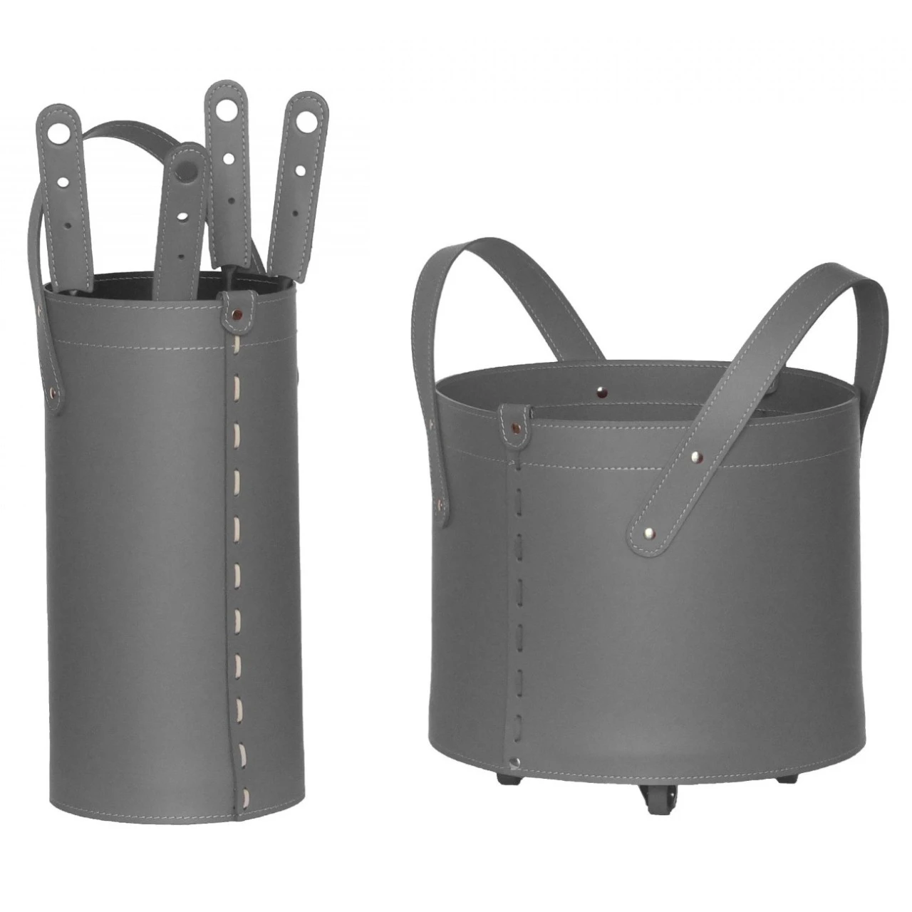 Set bestehend aus Kaminbesteckhalter aus Leder Mod. „Cinta“ und 4-teiliges Kaminbesteck mit Ledergriff Mod. „Mary“. Holzkorb aus regeneriertem Leder Modell Tonda „Mini“
