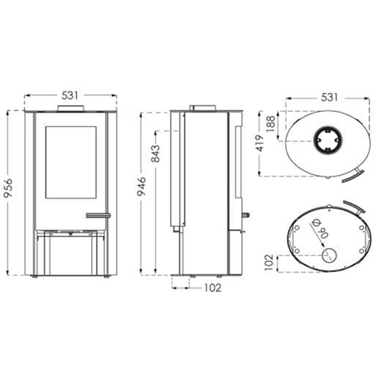 - Abstand von Mitte des Rauchstutzens bis zur Hinterkante des Ofens: 18,8 cm;