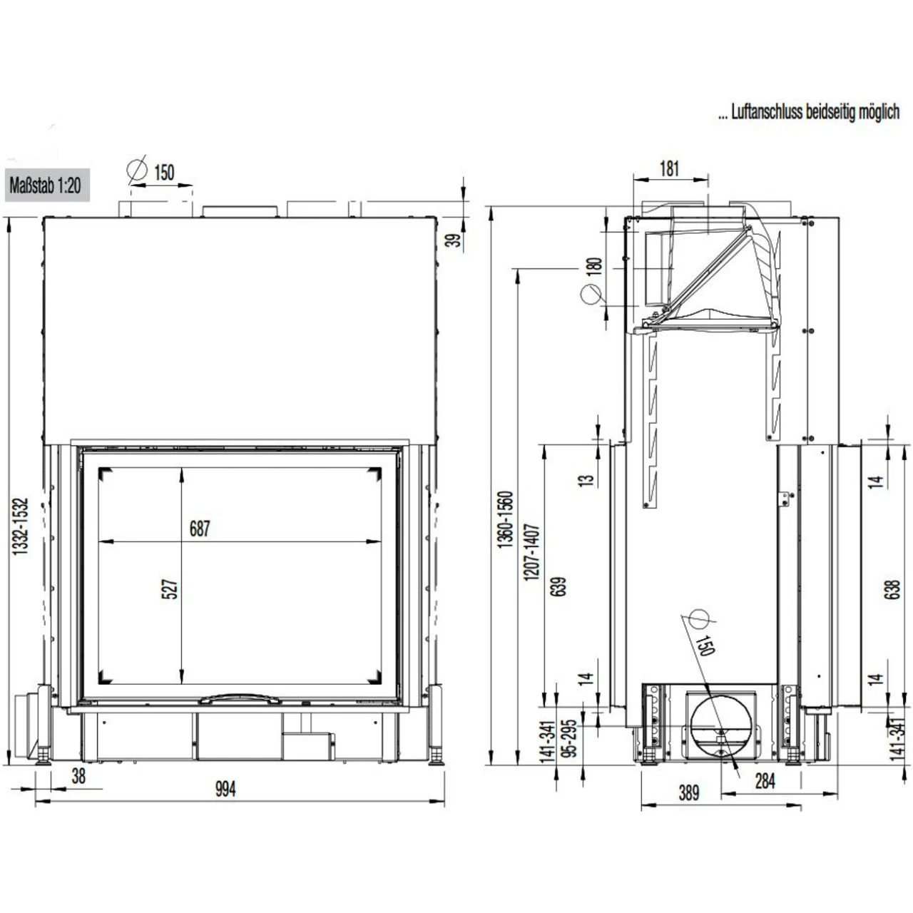 Weitere Maße finden Sie bei den Bildern und im Downloadbereich im Datenblatt (Achtung! Zeichnungen inkl. Konvektionsmantel und Designrahmen)