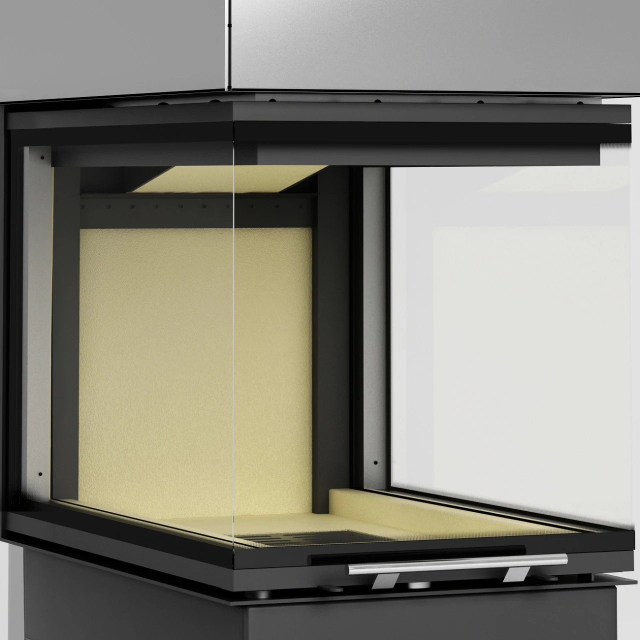 Modell: Hajduk Volcano 3PLUH Warmluft-Eckkamineinsatz, Dreiseitig Verglast und Rahmenlose Hebetür, die Glasscheibe kann geöffnet werden zum reinigen