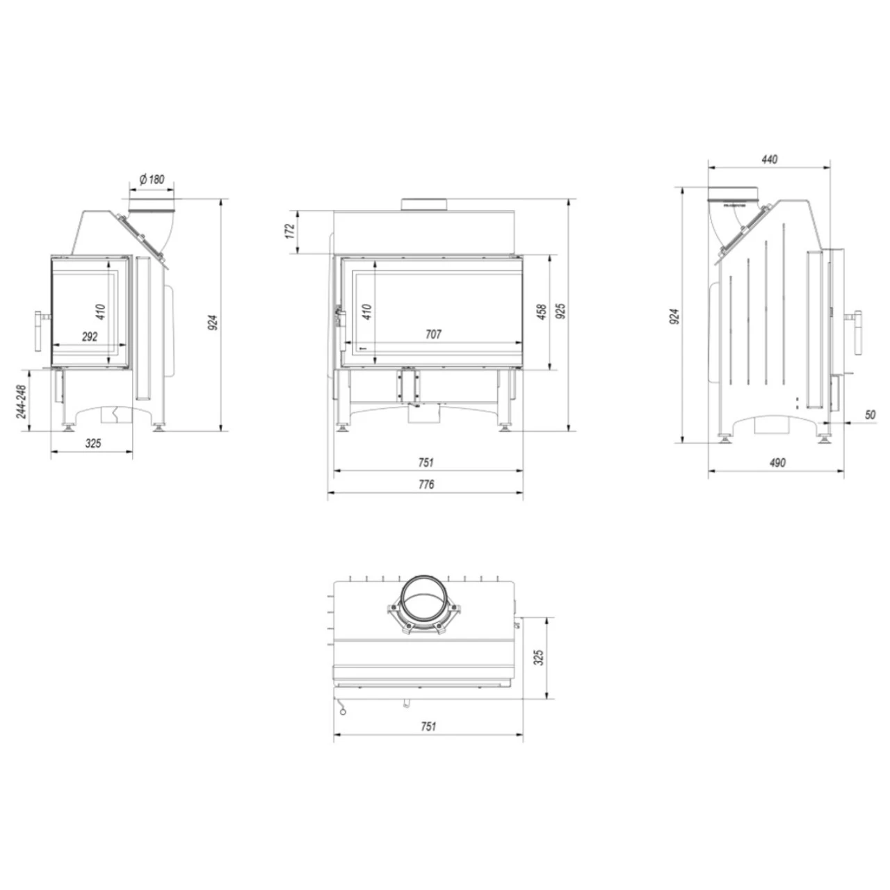 Der Kaminkorpus und die Vorderseite bestehen aus 4 mm dicken Stahlblechen und ermöglichen somit den Betrieb bei hohen Temperaturen